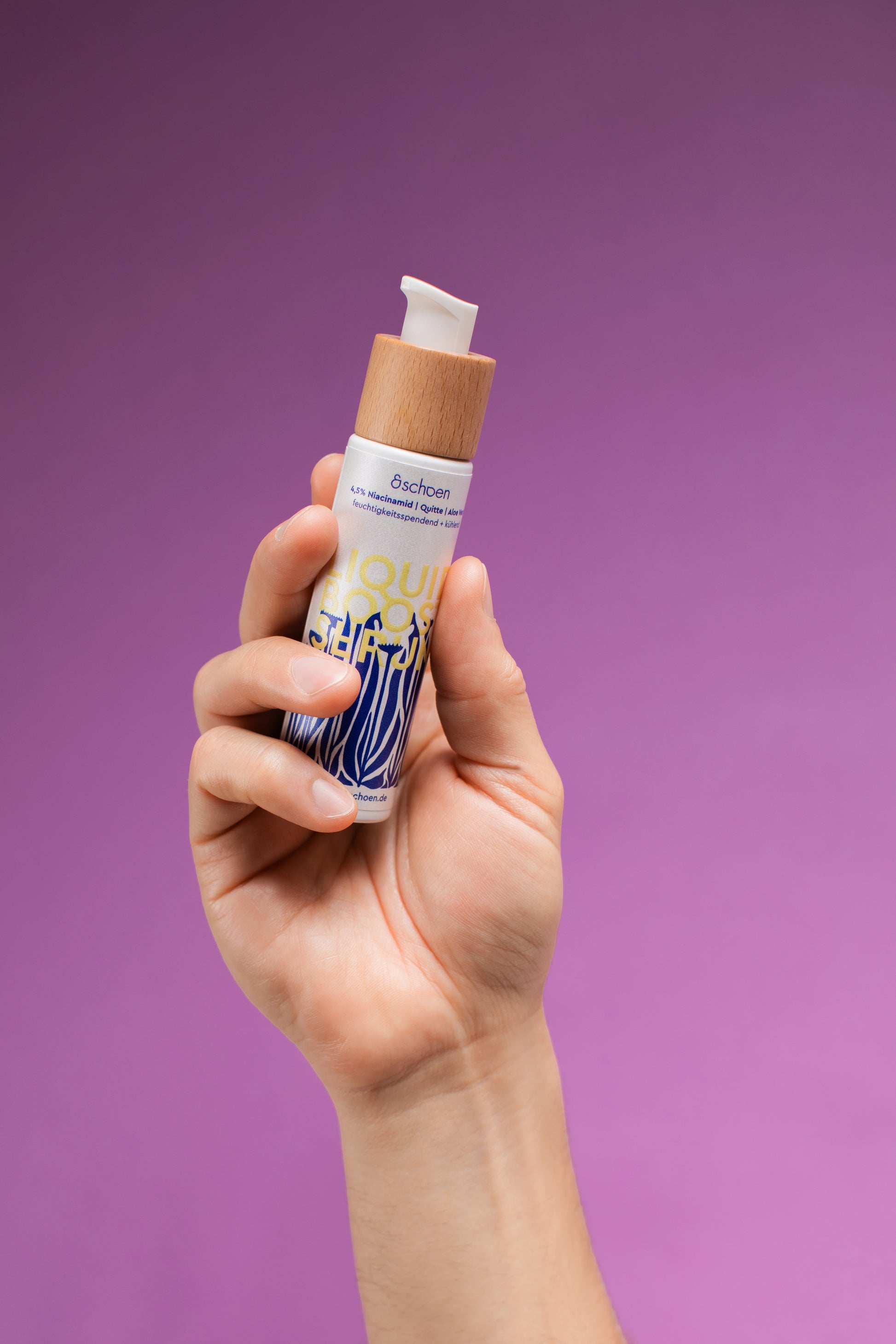 Gern nach der Reinigung/ deinem Tonic oder Pflanzenwasser trage 2-3 Pumps Liquid Boost Serum auf die feuchte Haut auf. Mit den Fingerspitzen sanft einarbeiten oder leicht einklopfen – so kann es optimal einziehen.